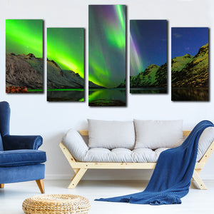 Snowy Mountains Canvas Wall Art, Northern Yellow Lights Forecast Norway Multi Canvas, Blue Archipelago Aurora Borealis Canvas Set, Lofoten Island 5 Piece Canvas PrintSold out